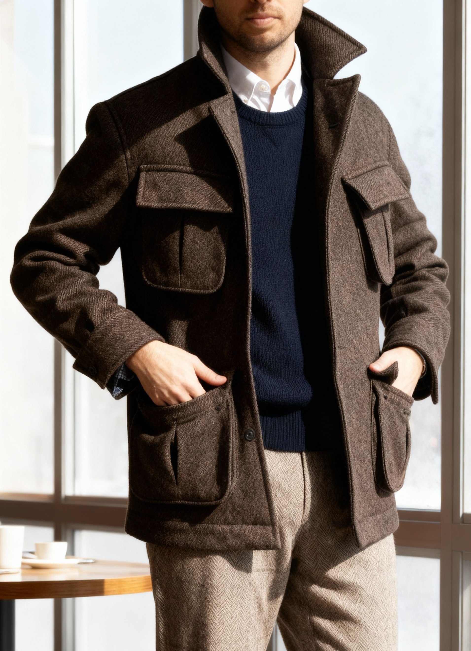 - des Jungle Jacket en laine et tweed chauds et épais: des vestes militaires de caractères, pas faciles à trouver en France et dans des laines bien chaudes à 230€